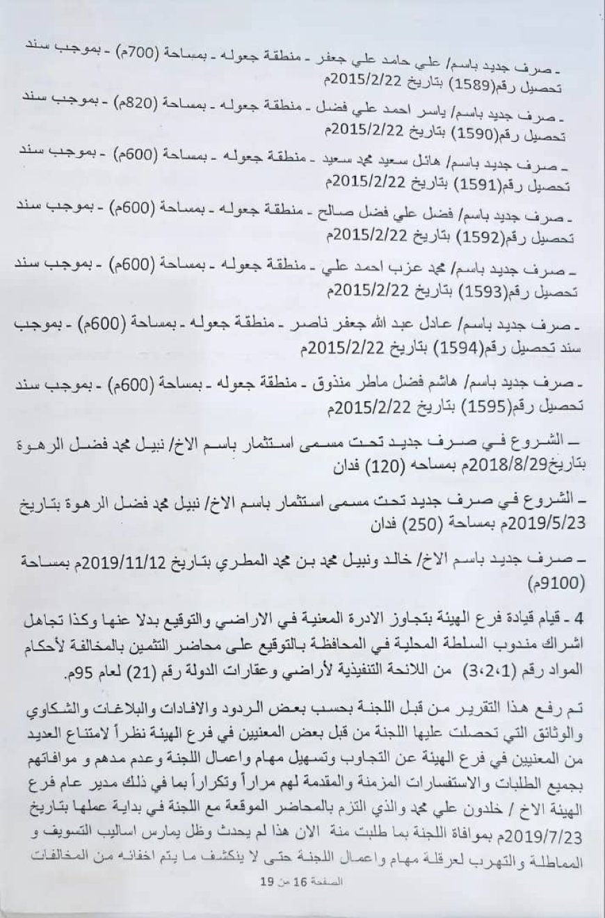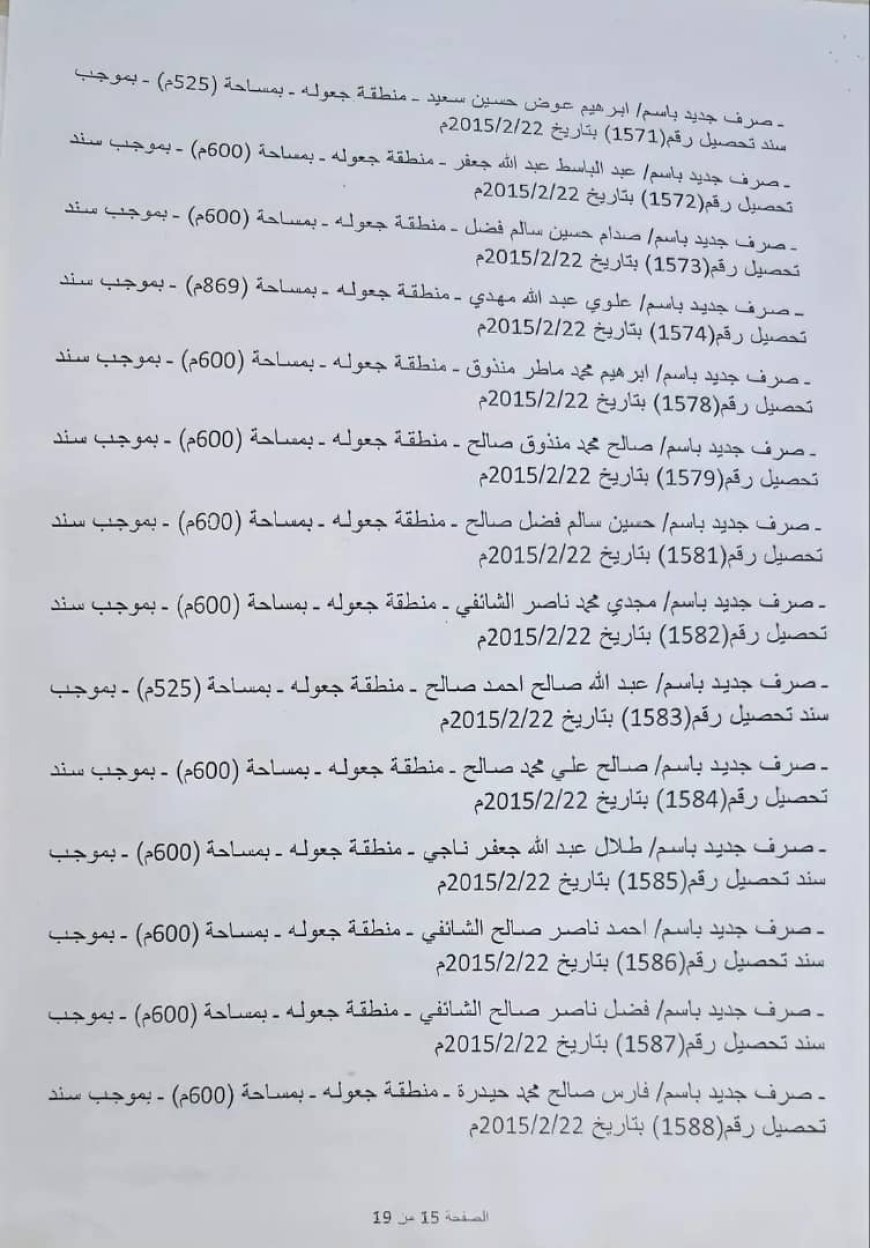 صرف سبعة فدان للأخ عبيد قاسم غالب (11/7/2019) رغم تخصيصها مسبقًا للأخ فاروق أحمد خد الجريك.