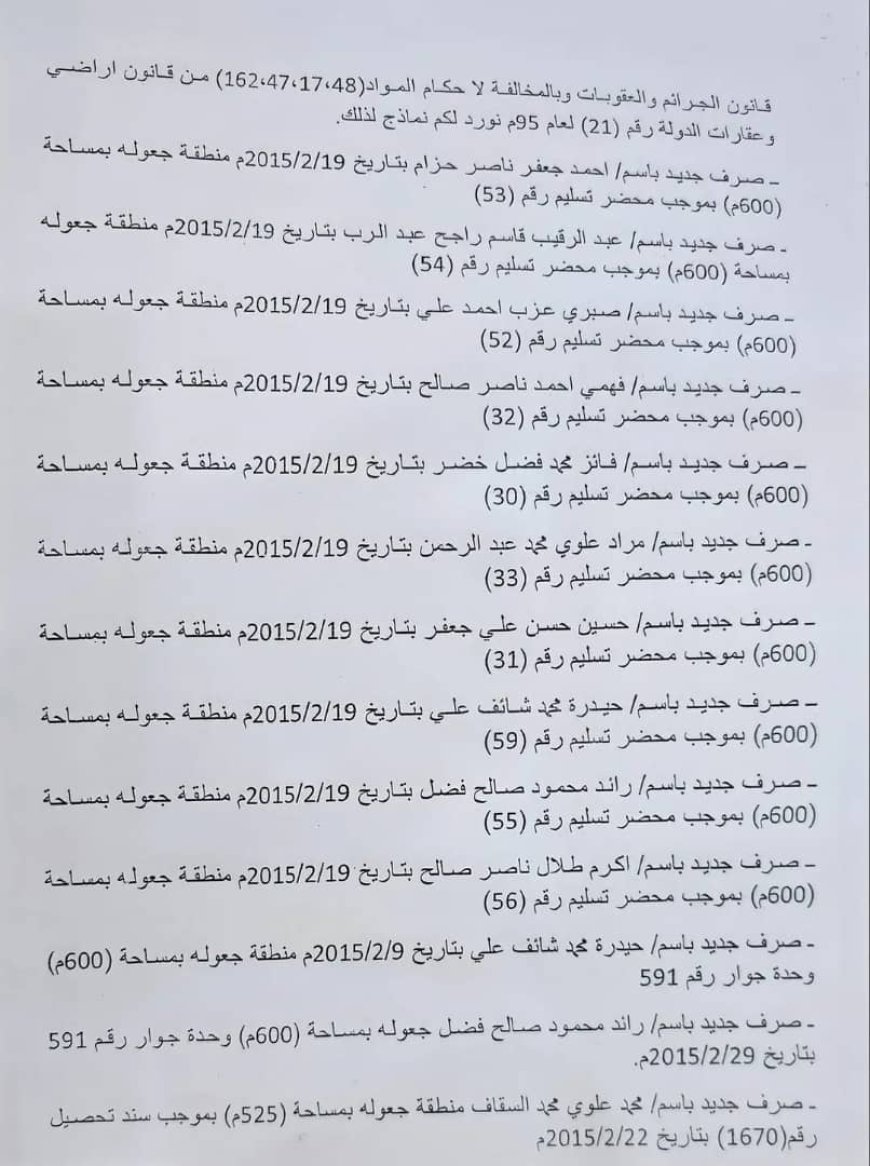 صرف أراضٍ لأكثر من طرف واحد مما تسبب في نزاعات وإقلاق للسكينة العامة.