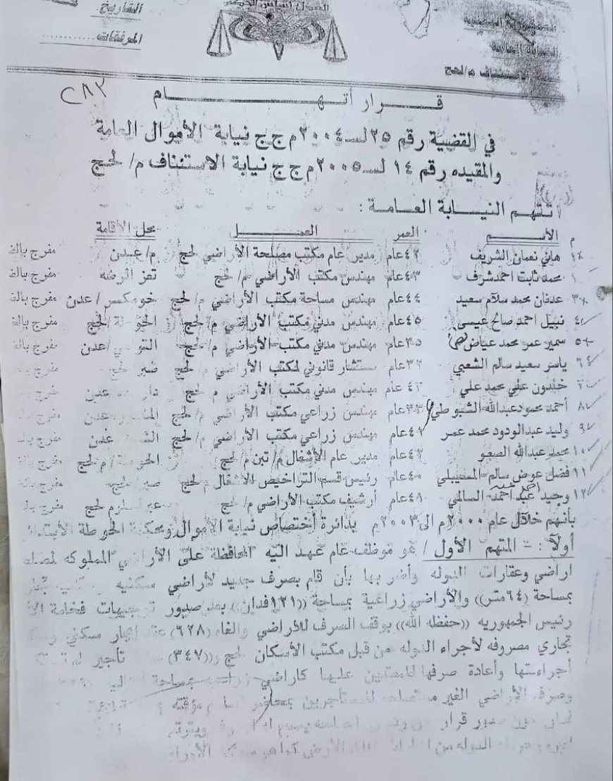 1. الإيقاف الاحترازي المؤقت لمدير مكتب الهيئة العامة للأراضي في لحج عن ممارسة مهامه حتى صدور أحكام قضائية باتة.