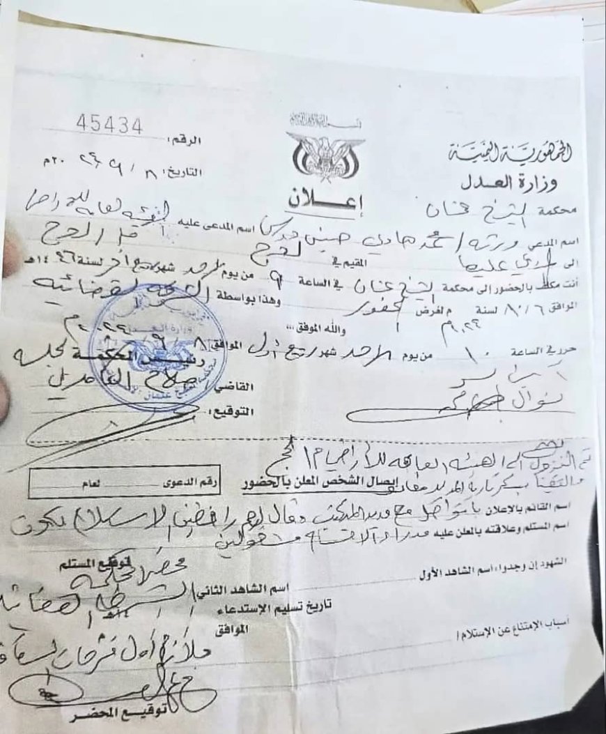 وثائق الاستدعاء القضائي – محكمة الشيخ عثمان (8/9/2024).
