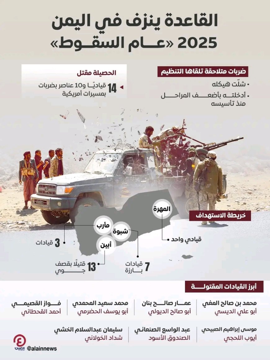 تلقى تنظيم القاعدة الإرهابي في اليمن سلسلة ضربات عنيفة، عبر استهداف قادته خلال عام 2025.