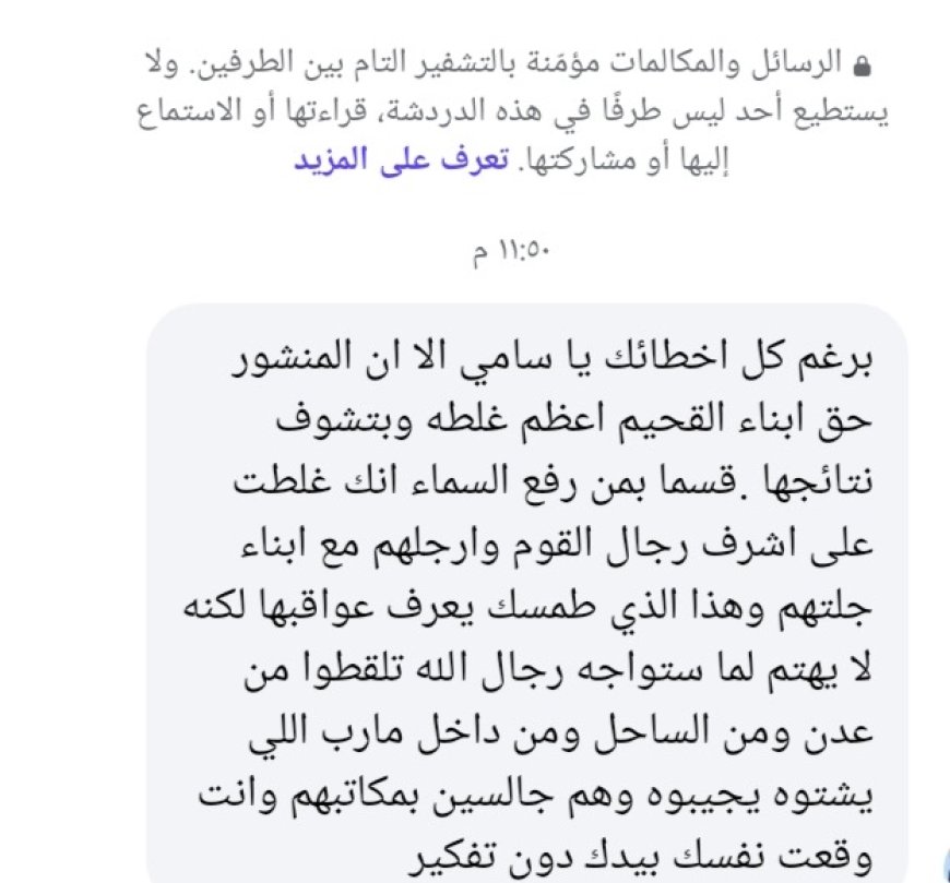 أرفع إلى سيادتكم هذا البلاغ بصفتي صحفي أمارس عملي الإعلامي المهني حيث تلقيت خلال الأسبوع الماضي سلسلة من التهديدات الخطيرة بالإختطاف والتصفية الجسدية من قبل عناصر تابعة لمليشيات الحوثي وقد وردت هذه التهديدات تارة عبر رسائل الخاصة وأخرى من خلال اتصالات هاتفية من رقم خاص ومخفي الهوية وان طبيعة هذه التهديدات الجدية تمثل انتهاكا صارخا لحرية الصحافة وحق التعبير كما تشكل خطرا مباشرا على حياتي وسلامتي الشخصية مما يثير ذلك القلق على حياتي وحياة اسرتي.